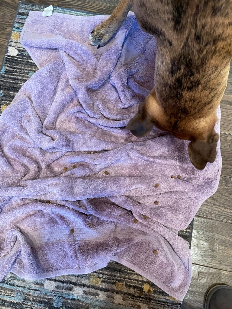 Involves my dogs using their sniffing for obtaining their meal. I decided to forgo snuffle mats and made my own for my boxers. The first time I didn’t present the food in the food bowl, but rather scattered on the towel, they looked at me confused. I had to show them how to sniff and forage for the food. The quickly caught on and I have been feeding them their meals this way for about 3 weeks now. The benefits have been nothing short of miraculous! Instead of spending 2-3 minutes gobbling down a meal they are spending at least 15 minutes foraging for their meal. That has added an additional 30 minutes of daily sniffing besides the 30-45 minutes they get each day on their walks. I have noticed a huge difference in their demeanor, they are much more relaxed and satisfied. My obsessed with fetch games girl is not longer whining constantly for something to do, she is on the bed sleeping! I would encourage anyone to add this enrichment for the good of their dog, I think you will be pleasantly surprised!!!